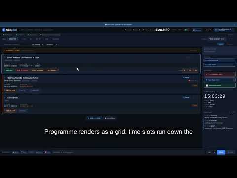 Create an event from scratch — event details, sessions, rooms, speakers, and running order. Ends with a full programme ready to go live.